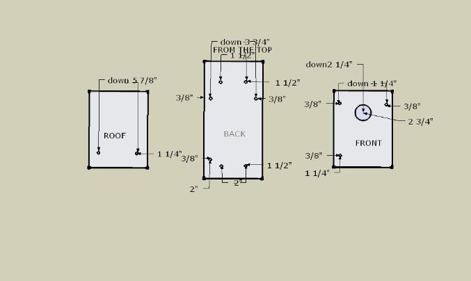 When you have finished cutting all your pieces. You will then be ready to start drilling the entry and pilot holes. With a 1/8 drill bit per drill the front,back and roof of your house. Next mark and drill the entry hole using a 1 3/8 hole saw bit. |